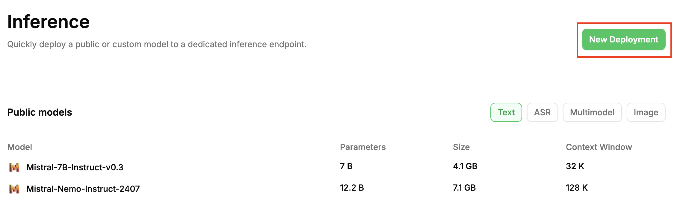 If you want to select a custom model that is publicly hosted on Docker Hub, for example, click "New Deployment" and fill your docker tag in the "Public Model" text field.