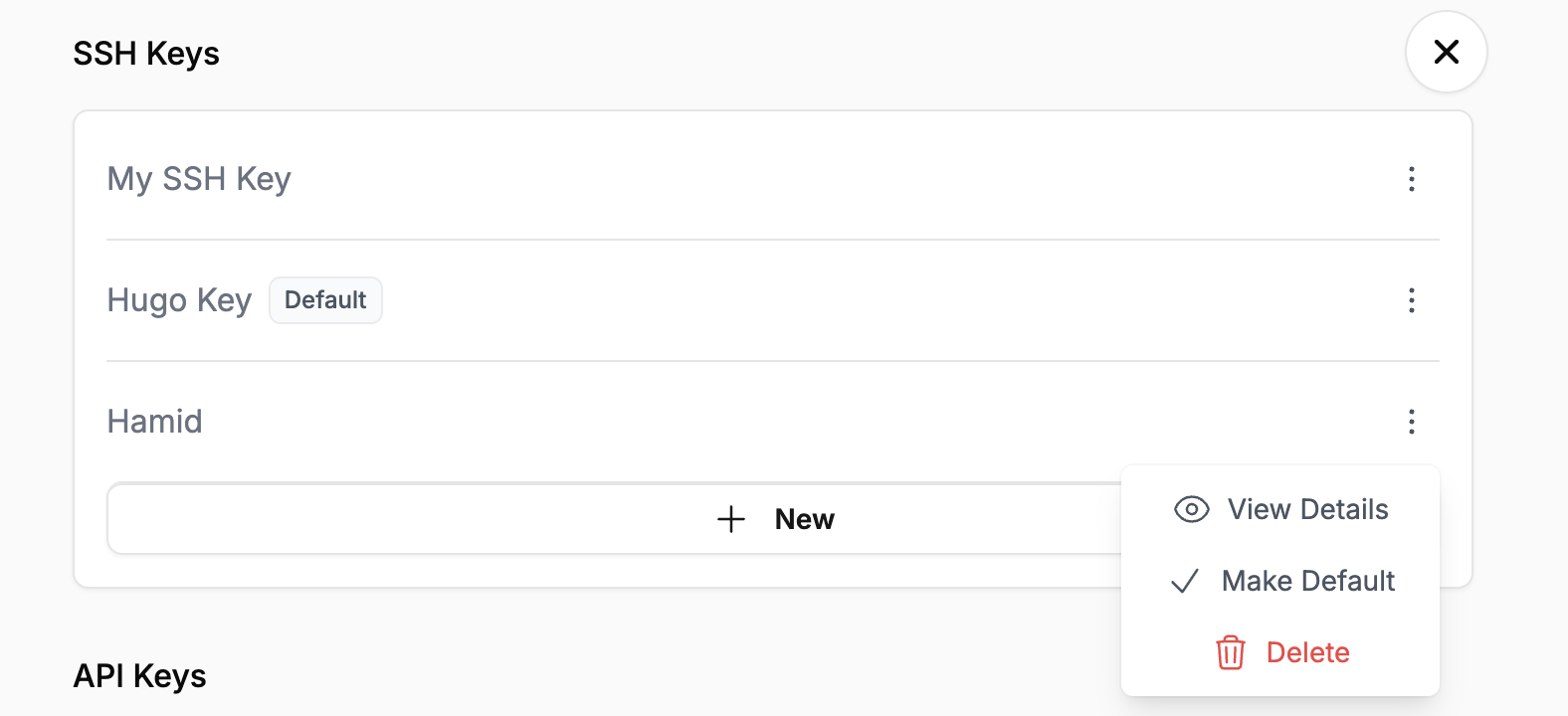 To mark a SSH Key as default, click on the 3 dots icon an select "Make Default". This will automatically select the SSH Key when you'll create a new Compute instance.